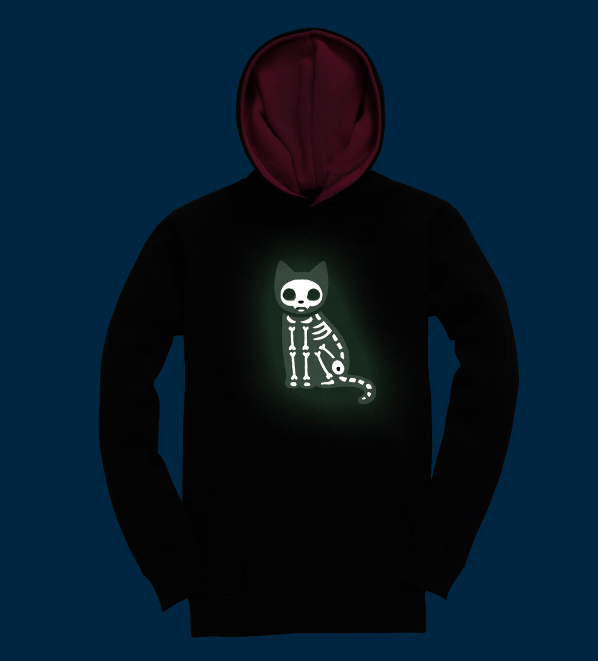 Introducing our enchanting kids' cat hoodie, where the feline's bones come to life with mesmerizing glow-in-the-dark magic!