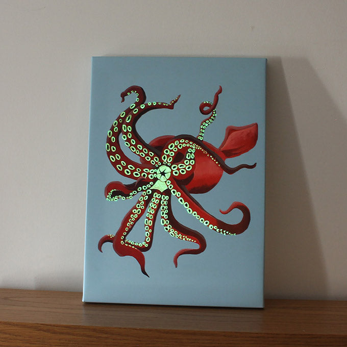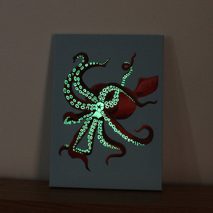 Daylight charges up the suckers so they appear at night. Each canvas is hand painted and unique.