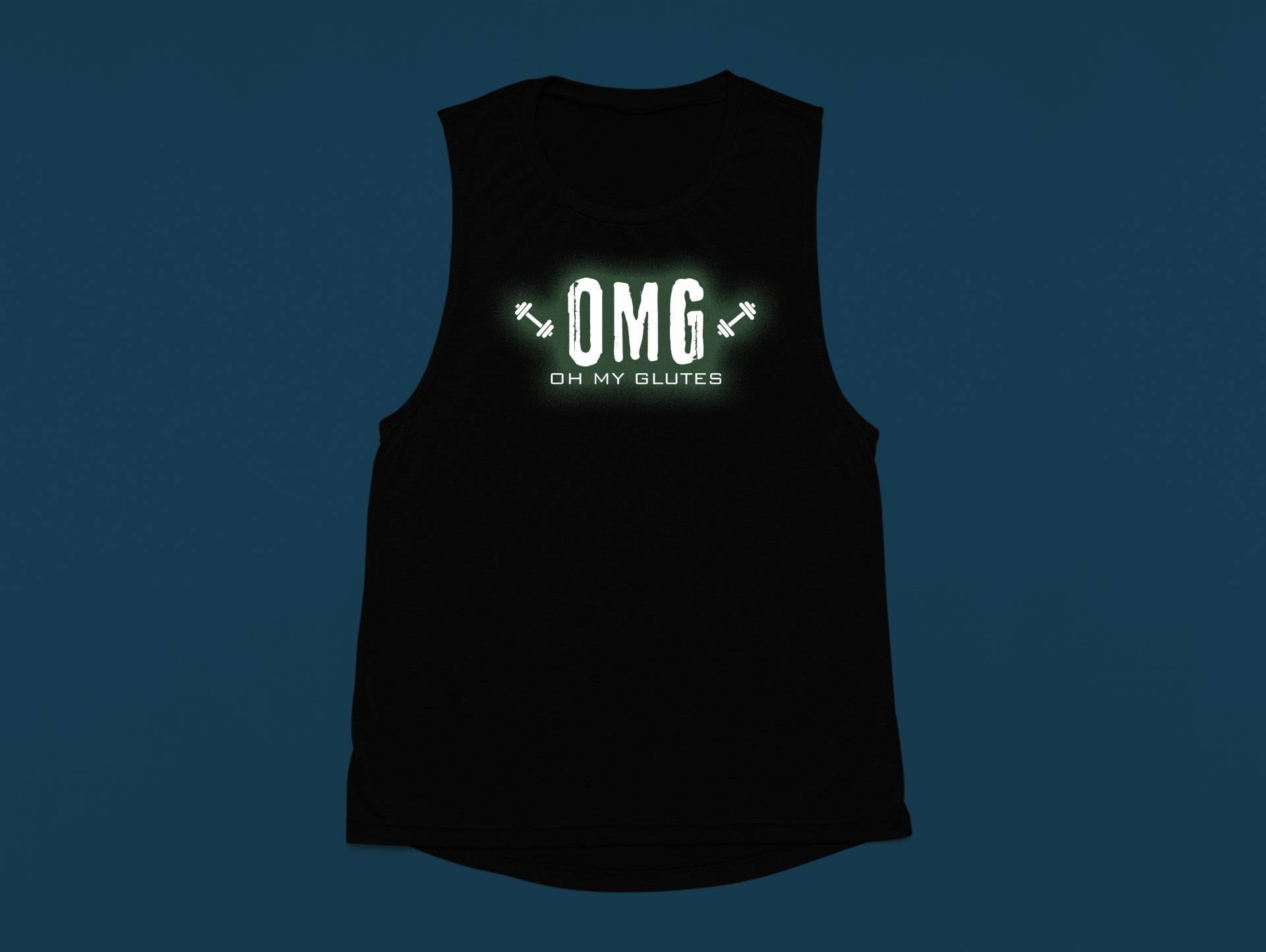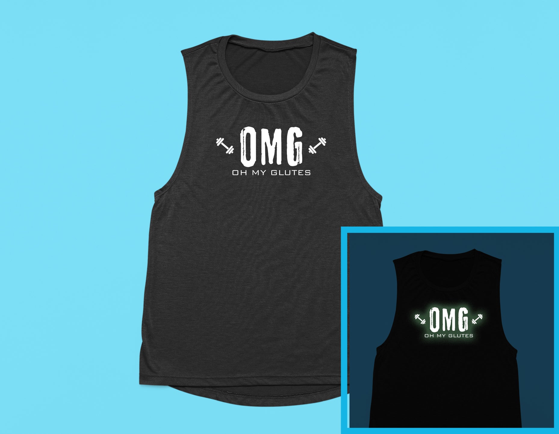 This high quality gym vests not only looks great by day BUT even better at night when OMG glows bright in the dark.
