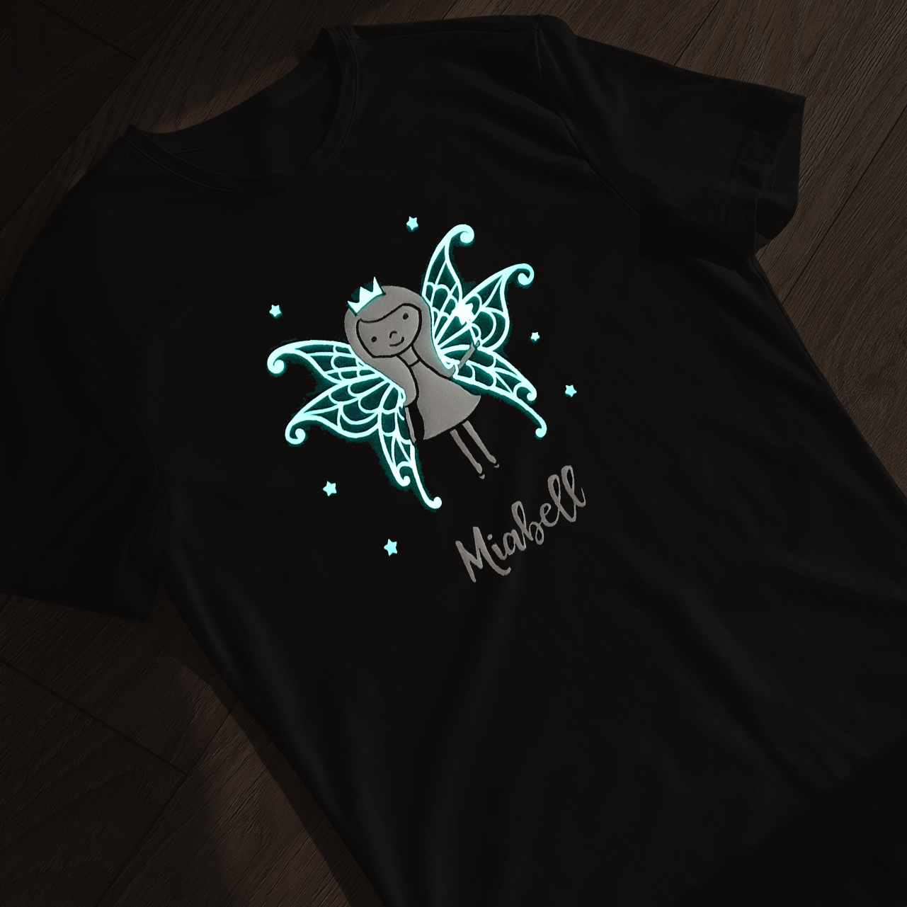 Calling all little pixies and sprites! ✨ Get ready to light up the night with our glow-in-the-dark fairy t-shirt! Not only can you personalise it with your a name, but the wings also glow in the dark for extra fun after bedtime! It's like having a secret fairy party wherever they go. Spark their imagination and let the magic shine with this fantastical tee!
